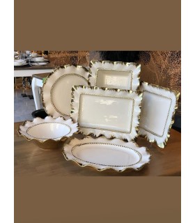 ست 6 پارچه دیس سرامیکی سفید طلایی برند roy king ترکیه شامل: 1 عدد دیس گرد (قطر 31 سانتی متر) 1 عدد کاسه گرد (قطر 28 سانتی متر) 1 عدد دیس مربع (30 سانتی متر) 1 عدد کاسه مربع (26 سانتی متر) 1 عدد دیس مستطیل (34x24 سانتی...