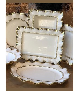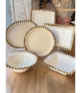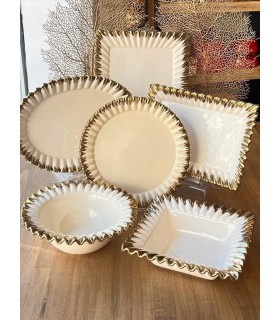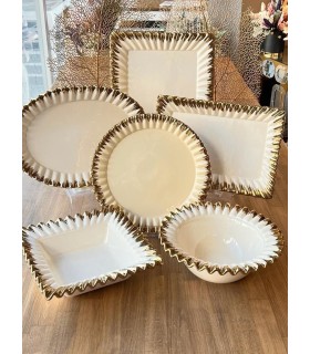 ست 6 پارچه دیس سرامیکی سفید طلایی ترک برند roy king شامل: 1 عدد دیس گرد (قطر 34 سانتی متر) 1 عدد کاسه گرد (قطر 29 سانتی متر) 1 عدد دیس مربع (26 سانتی متر) 1 عدد کاسه مربع (27 سانتی متر) 1 عدد دیس مستطیل (36x25 سانتی...