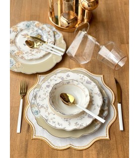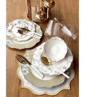 سرویس غذاخوری 6 نفره 24 پارچه مدل bloom رنگ طلایی از برند rossev ترکیه شامل: 6 عدد بشقاب پلوخوری 6 عدد بشقاب خورشت خوری 6 عدد پیش دستی 6 عدد کاسه جنس این سرویس غذاخوری زیبا بن چاینا است که در عین ظرافت و سبکی بسیار...