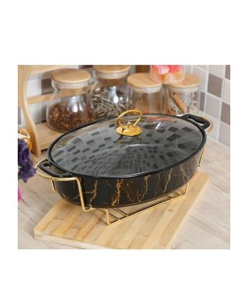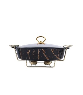سوفله خوری وارمردار طرح مرمر مشکی بیضی شکل برند arow ترکیه - از جنس چینی طرح مرمر مشکی - به همراه استند فلزی طلایی وارمردار - دارای درب پیرکس با دستگیره فلزی